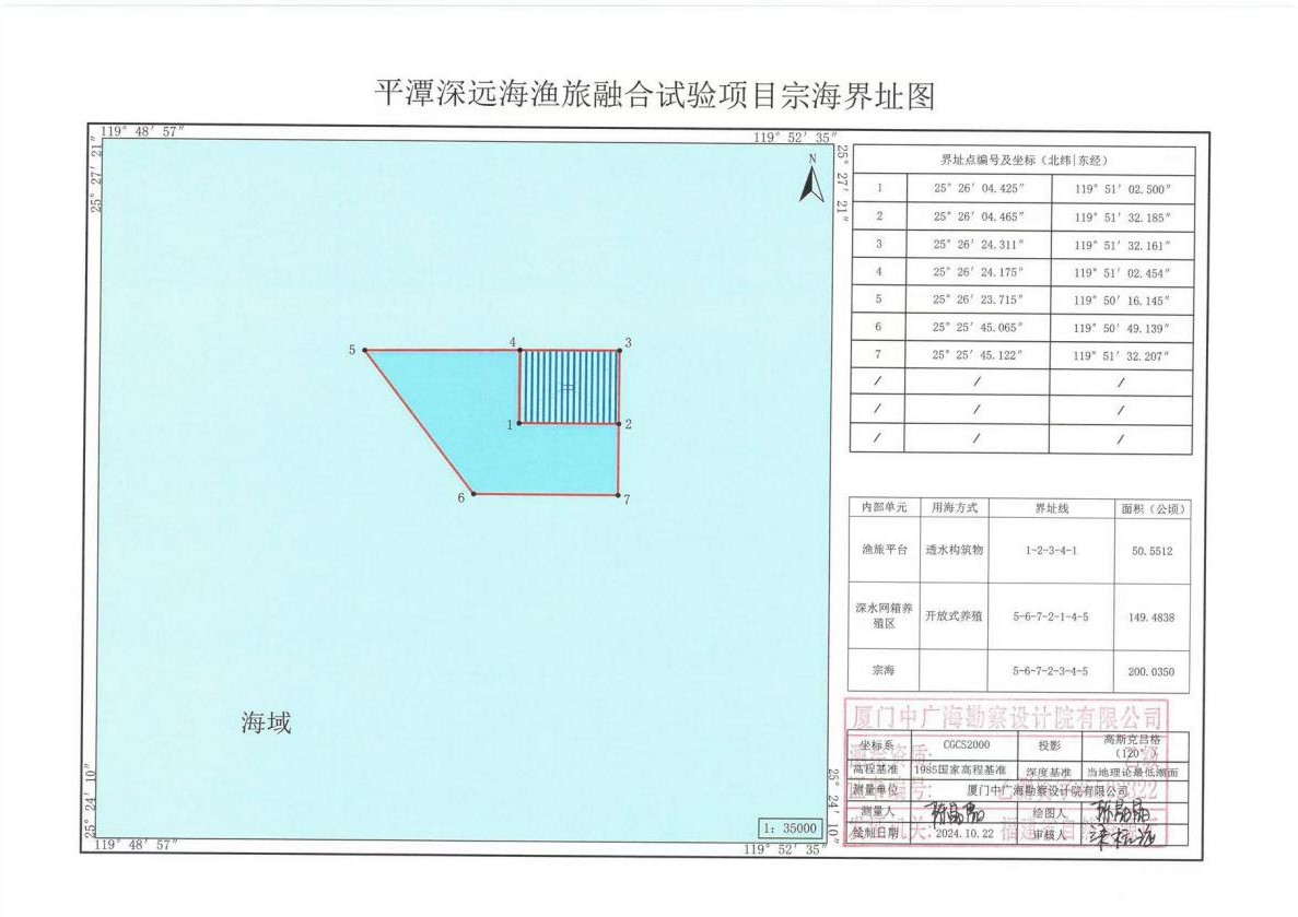 用海面积200.0350公顷,其中:渔旅平台及其锚链区用海面积50.5512公顷、用海方式为“透水构筑物”,深水网箱养殖区用海面积149.4838公顷、用海方式为“开放式养殖”。乐动(中国)用海符合《平潭深远海渔旅融合试验乐动(中国)海域使用论证报告书(报批稿)》要求。 |