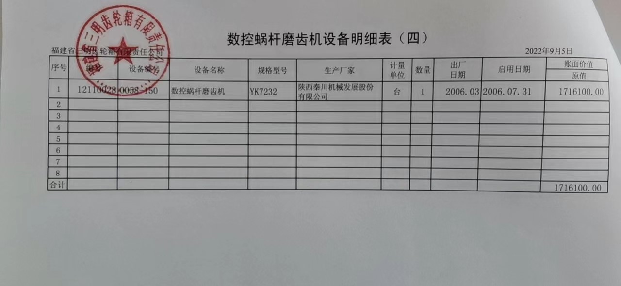 二、乐动(中国)简况:转让标的主要有花键轴铣床、锥齿轮刨齿机、万能磨床、立式车床等,按序号分4个标的交易,每一标的具体内容分别详见《设备明细表》(一)、(二)、(三)、(四)。设备于1966至2010年间购置,目前均为闲置状态,均放置在福建省三明齿轮箱有限责任公司位于三明市梅列区陈大镇高源工业区13号厂房内。经评估,基准日2022年2月19日的全部资产评估值为58.97万元(金额取整至百元),其中各项转让标的评估值请见上表。