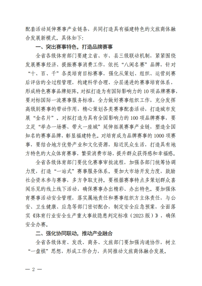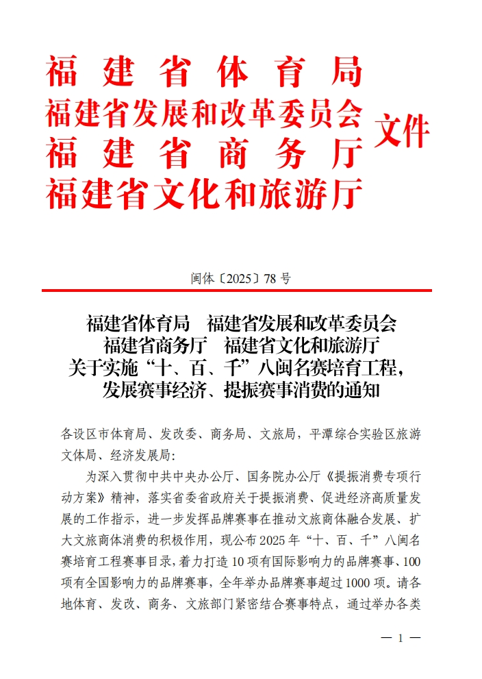 为深入贯彻中共中央办公厅、国务院办公厅《提振消费专项行动方案》精神,落实省委省政府关于提振消费、促进经济高质量发展的工作指示,进一步发挥品牌赛事在推动文旅商体融合发展、扩大文旅商体消费的积极作用,近日,福建省体育局联合福建省发展和改革委员会、福建省商务厅、福建省文化和旅游厅,印发关于《实施“十、百、千”八闽名赛培育工程,发展赛事经济、提振赛事消费》的通知。