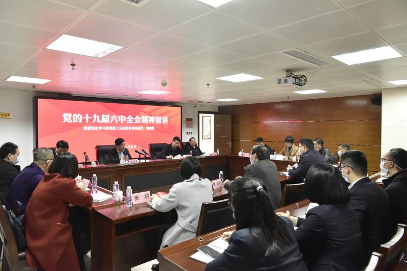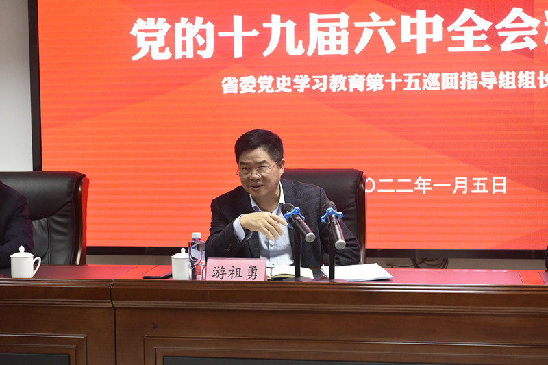 1月5日下午,根据省委统一部署,省委党史学习教育第十五巡回指导组深入省产权交易中心宣讲党的十九届六中全会精神,指导组游祖勇组长作宣讲报告,省产权交易中心党支部书记、总经理张亚明主持宣讲会。省国资委党委副书记修兴高、省国资系统党史学习教育各巡回指导组组长、委机关党委(人事处)负责同志、省产权交易中心职工等30余人参加宣讲会。