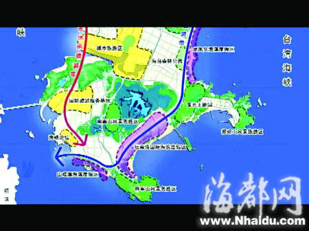 具体规划为,完善城市旅游接待服务功能,建设海峡旅游集散中心、休闲娱乐中心与接待服务中心,引入汽车租赁公司;在新城区规划建设过程中,考虑引入台湾风情元素,形成具有台湾休闲特点的餐饮街区、台货街区以及风情街区;依托龙凤头海滩的资源,建设龙凤头滨海观光休闲旅游带。