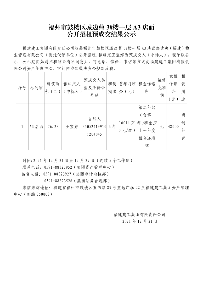 | 租赁(承包)标的 | 福州市鼓楼区城边曹3#楼一层A3店面公开招租预成交结果公示 |