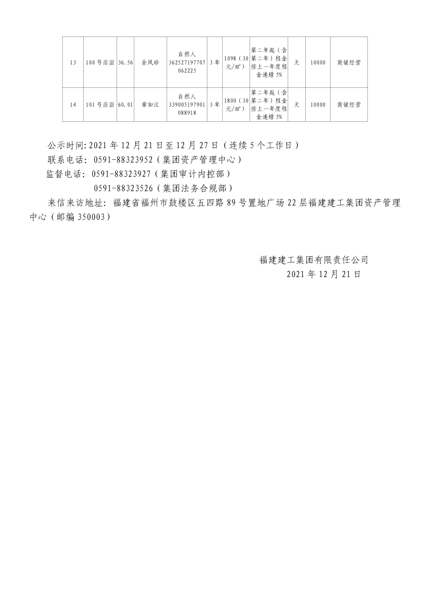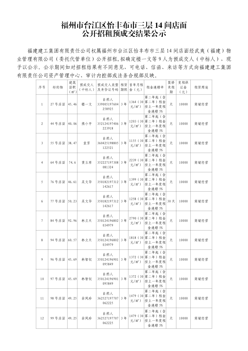 | 租赁(承包)标的 | 福州市台江区怡丰布市三层14间店面公开招租预成交结果公示 |