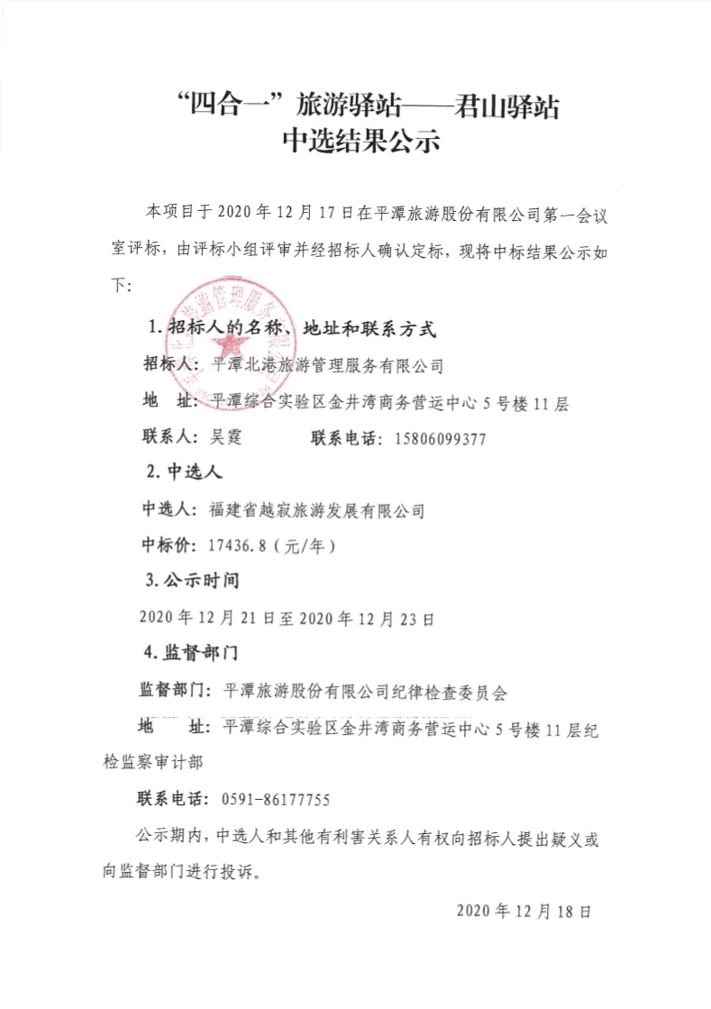 | 租赁(承包)标的 | “四合一”旅游驿站招商乐动(中国)——君山驿站中选结果公示 |